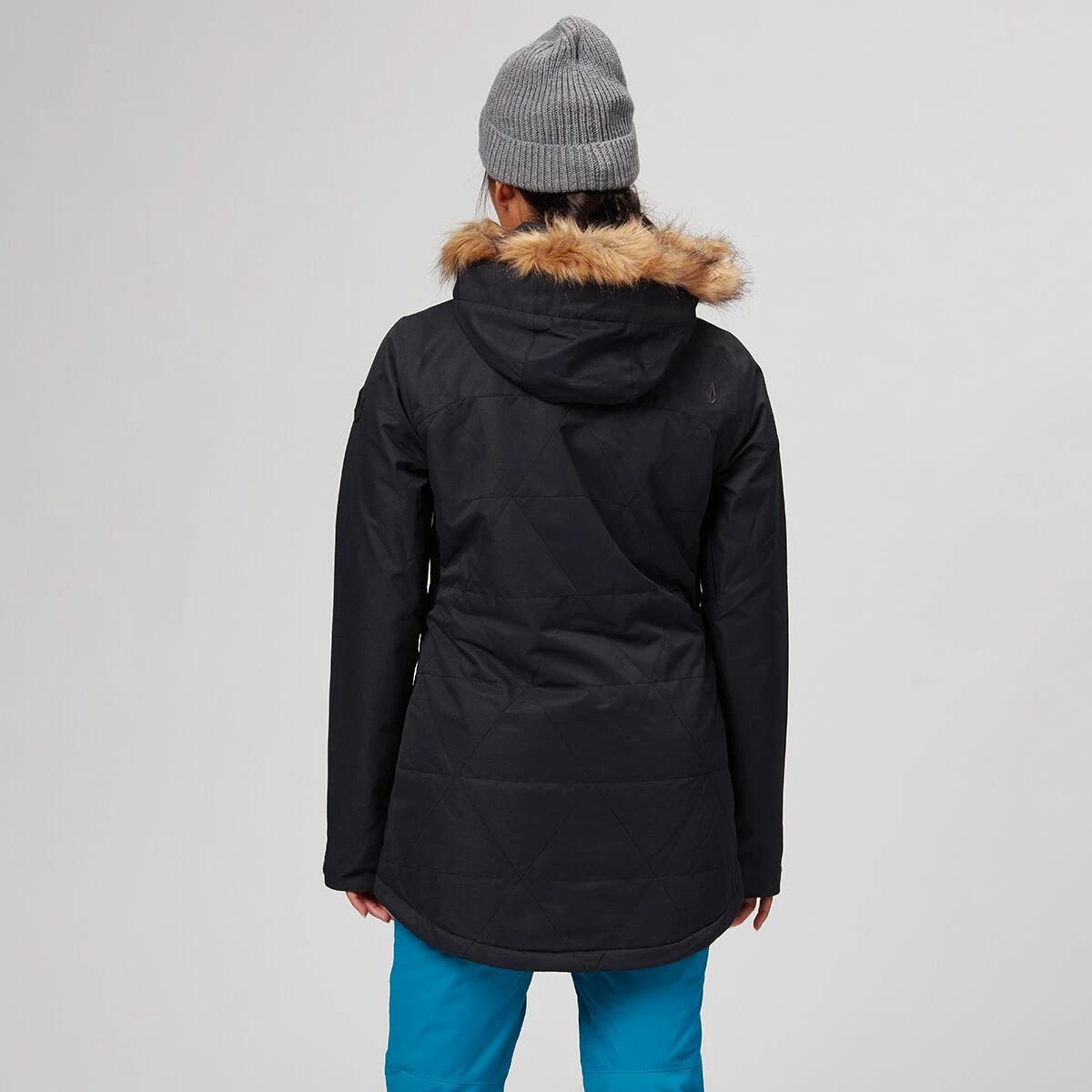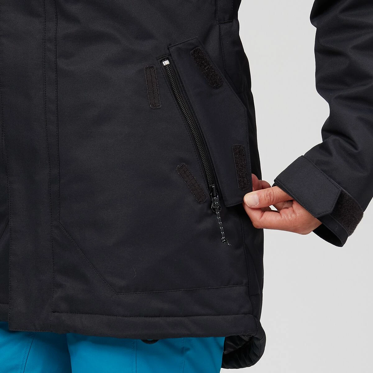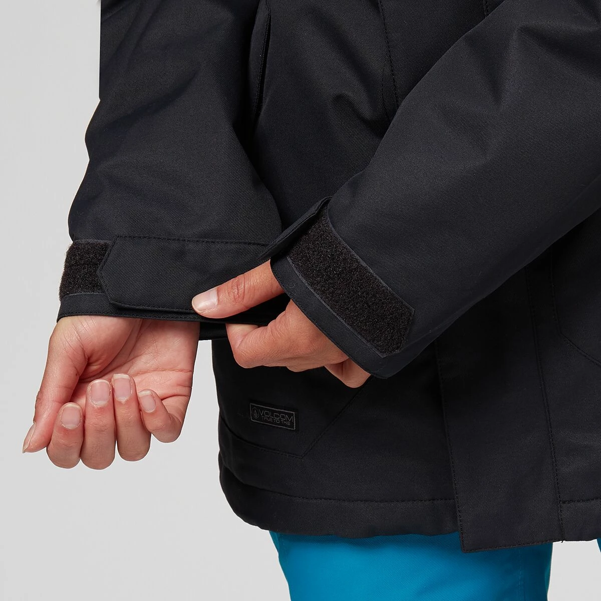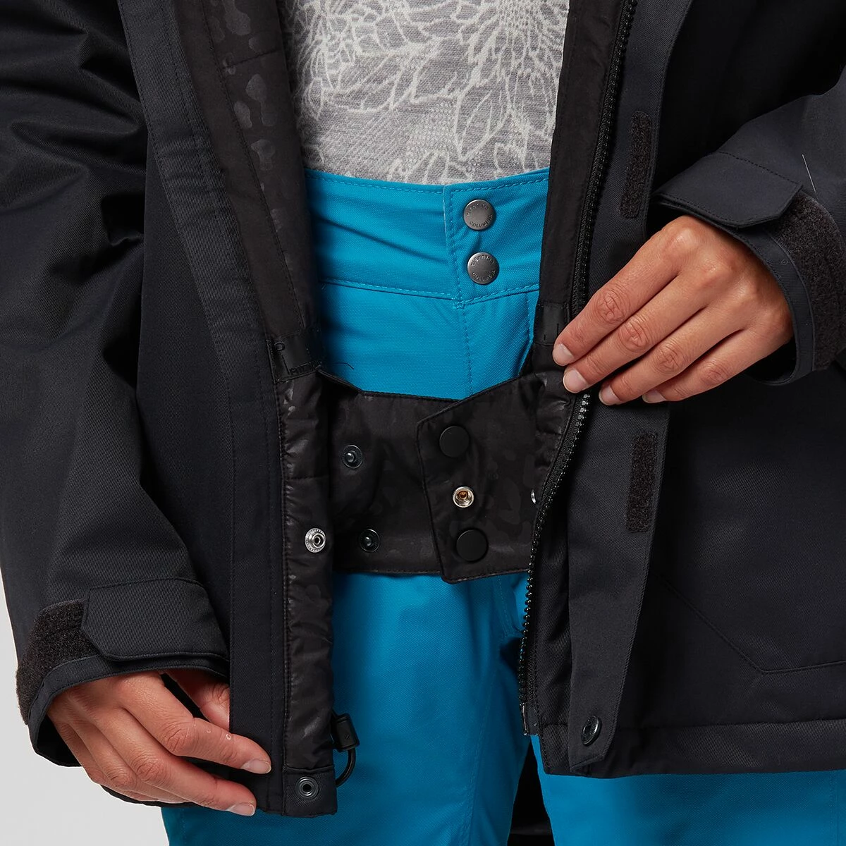 The jacket’s powder skirt keeps snow from creeping in on waist-deep days, and the jacket-to-pant interface works with Volcom pants to create a seal between you and the elements. A longer fit provides extra coverage and a sleek, flattering aesthetic, and multiple pockets keep your on-mountain essentials secure and accessible so you can stay out and shred longer.