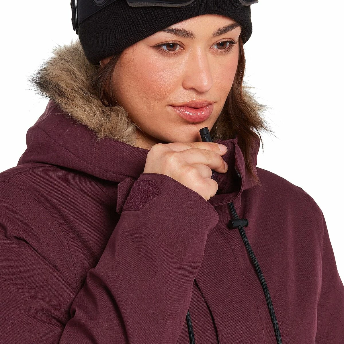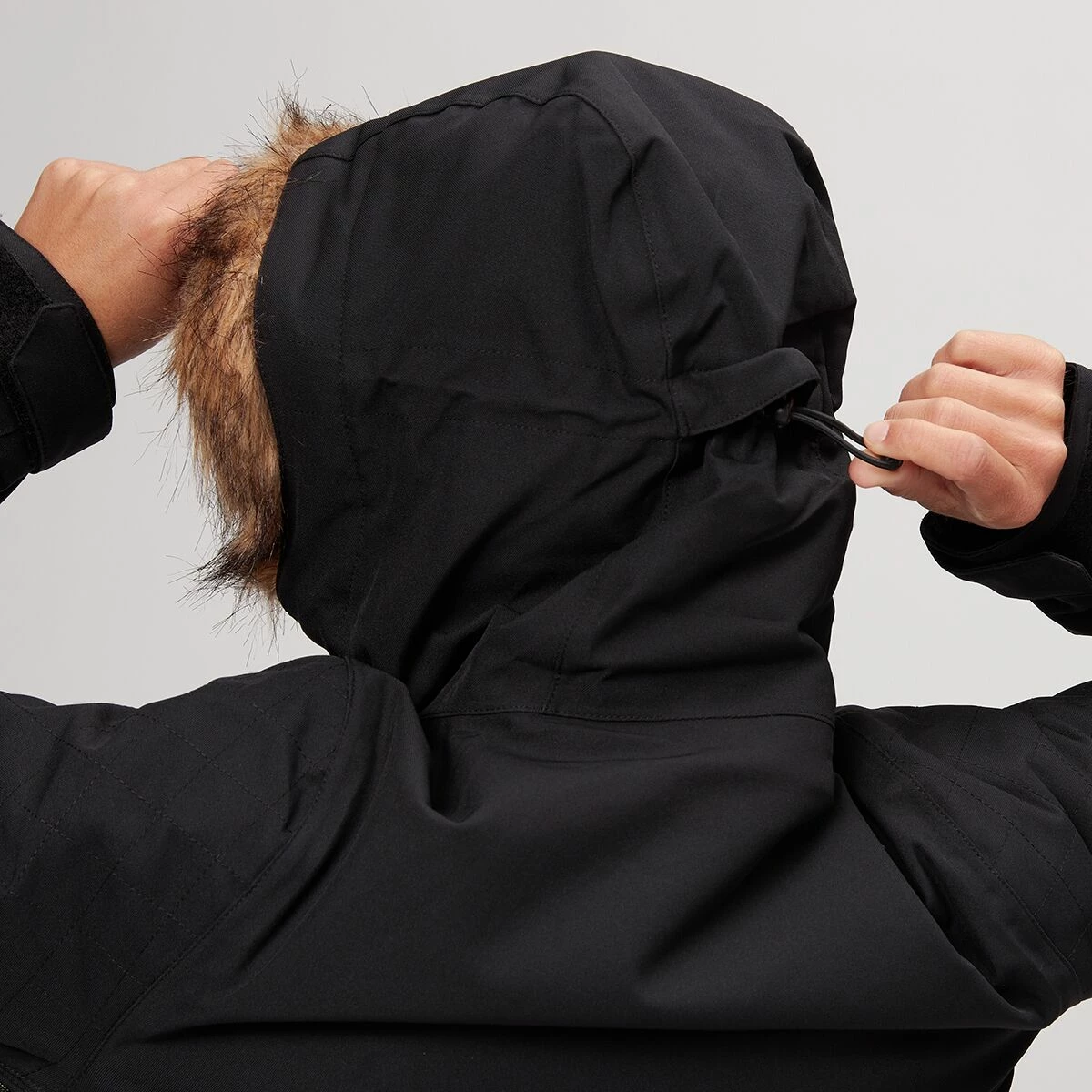 - Hood: yes, detachable faux fur trim
